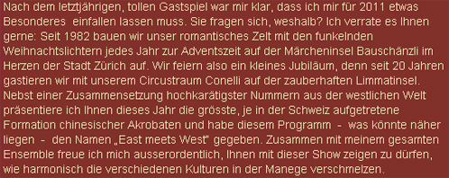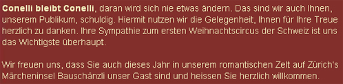 | Ich bin überwältigt! Bestimmt werden Sie sich fragen, weshalb? Ich kann Ihnen die einfache Antwort auf diese Frage geben: Ich bin überwältigt von Ihnen. Sie sind es, die uns Circusleute dazu anspornen, das Beste aus uns herauszuholen. Sie haben mir mit Ihrer Treue zum Original Schweizer Weihnachtscircus in den letzten Jahren bewiesen, dass ich den richtigen Weg eingeschlagen habe, die Zürcher Märcheninsel Bauschänzli während der Adventszeit Jahr für Jahr zu einer weihnachtlichen Oase zu verpacken. Die vielen Standing Ovations anlässlich des letztjährigen Gastspiels haben mir einmal mehr gezeigt, wie sehr der Conelli-Besucher das Bedürfnis verspürt, eine richtige Weihnachts-Show, die ihn im Herzen berührt, inmitten von Gleichgesinnten zu geniessen. Dafür bin ich Ihnen zutiefst dankbar. |