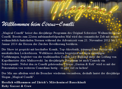 „Die Adventszeit beginnt dann, wenn das romantische Zelt des Weihnachtscircus Conelli auf der Zürcher Märcheninsel Bauschänzli steht.“ Das ist die Meinung der Zürcherinnen und Zürcher, die das Original der Schweizer Weihnachtscircusse jeweils mit grosser Vorfreude in der Stadt erwarten.